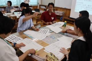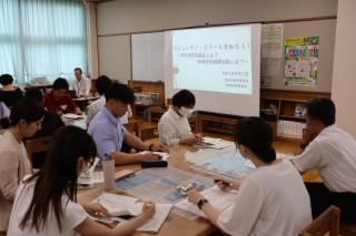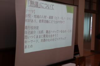 初めに講師の方よりコミュニティ・スクールの概念についての説明がありました。先行導入されている学校の実践例を交えながらわかりやすく説明してくださいました。その後、各学年の教育課程を見直しながら、どこでコミュニティ・スクールが活用できるのかそれぞれグループになり検討会を行いました。