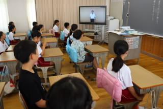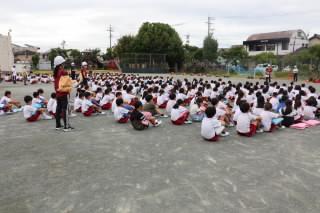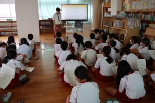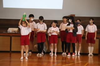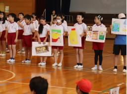 〈JRC委員会が月に1回各教室に設置してあるベルマークボックスの回収をしていることやベルマークの合計点数によってみんなが使うボールや勉強道具と交換できることを伝えました。どんなものにベルマークがついているのかクイズで出されると多くの子が知っていました。〉