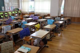 〈訓練用の緊急地震速報が流れると子どもたちは、素早く机の下に身を隠すことができました。〉