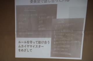 〈次に第一回学校保健委員会の結果報告がありました。歯磨き、早寝早起きなどのアンケート結果から学校保健委員会で話し合ったことが伝えられ、「ムカイヤマイスター」を目ざし、今後もがんばっていこうと呼びかけがありました。〉
