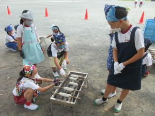竹の棒に魚のすり身を巻き付けたら、炭で回しながら焼くよ。上手にできるかな?