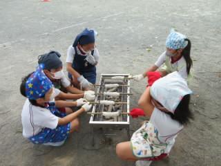 講話の後には、実際に魚のすり身を竹に巻きつけて、炭火で焼いてちくわ作りを体験しました。