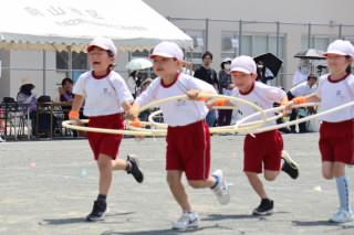 2年生が、4つのフラフープを使ってリレーをしました。4人で息を合わせて、うまく仲間につなげました。力を合わせてがんばりました。