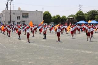 この日は、朝から晴天でとても暑くなりました。運動場の子どもたちの控え席にはPTAから寄贈されたテントを張りました。