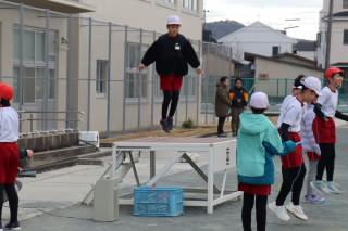 最後には、誰が残るか選手権がありました。1~3年生は前跳び、4~6年生は後ろ跳びで、アンパンマンのマーチの曲が終わるまで引っかからずに跳ぶことに挑戦しました。最後まで引っかからずに跳べた児童は、どの学級も数人ずついました。