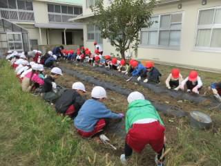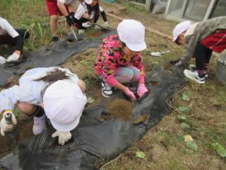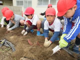 6月に植えたサツマイモが育ち、いよいよ待ちに待った芋ほりの日です。子どもたちは、とても楽しみにしていました。これまでに芋掘りを体験したことがない子も、保育園で体験したことがある子も目を輝かせ、汗を流しながら一生懸命に掘りました。