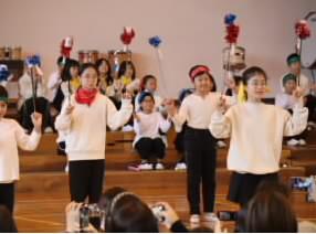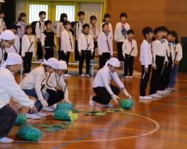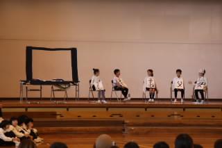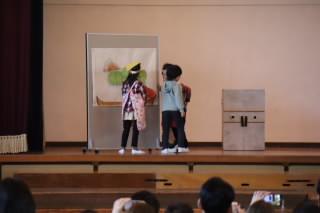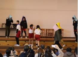 生活科の学習で、梅ジュース作りに挑戦した2年生。梅がどれだけ健康によいか、多くのことを学びました。その学びの成果を、楽しい劇、歌やダンスで表現しました。