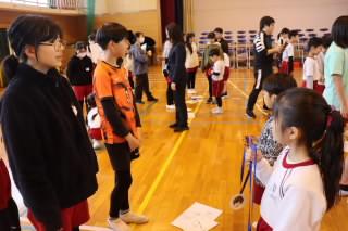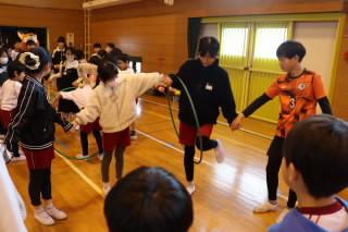 はじめのことばのあとは、ふれあい活動(たてわり活動)でゲームを楽しみました。2分でフラフープを何回くぐることができるか班ごとで挑戦をしました。