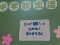各学級の様子を見ながら校舎内をうろうろしていたら、3学年の目標の掲示物を目にしました。「互いの違いを認め合う」いわゆる「多様性」が学びの中心に据えていることが素晴らしいと感じています。ちゃんと世界の潮流をつかんでくれていることをうれしく思います。