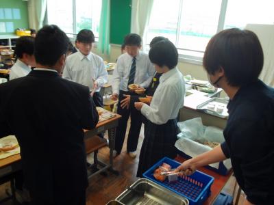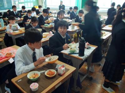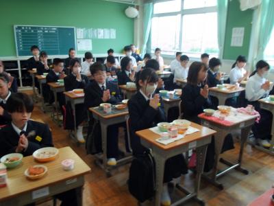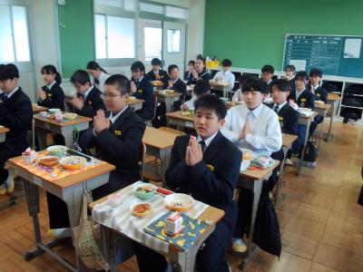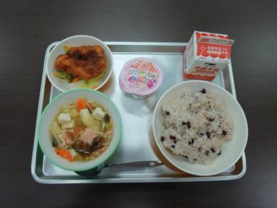今日から給食がスタートしました。初日のメニューは、すまし汁、チキンカツ(大きくなった中学生サイズ)、ゆでやさい(にんじん、キャベツ)に、入学進級のお祝いとして、ご飯は赤飯に、デザートにはお祝いイチゴゼリーが付きました。1年生と小学校から異動してきた私にとっては、チキンカツが10gほどジャンボになる、喜び満載、食べ応え万歳となりました!