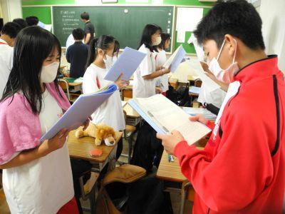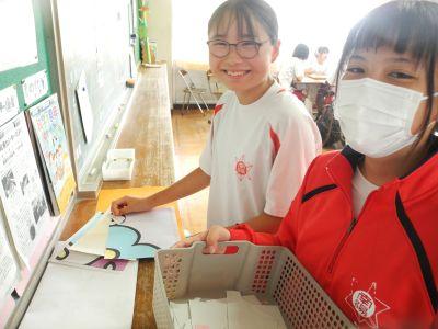 「おはようございま~す!〇年△組の▢▢に清き一票をお願いしま~~す!」登校時の昇降口は、立候補者の最後のお願いでとても盛り上がっていました。6限の選挙はこれまでとスタイルを変更し、「リモート演説会」&「教室投票」で行いました。体育館に全校生徒が集まらなくても、立候補者がカメラを通して演説する『被服室』、立候補者の思いを受け止める『各教室』、ともに大きな緊張感に包まれていました。どの立候補者も、自分の思いを堂々と話すことができ、南陽中をよりよくしたいという意気込みが伝わってきました。各教室での投票は、選挙管理委員の指示で、緊張した雰囲気のなか、終始無言で行われました。立候補した生徒の思いに対し、真剣に向き合う姿がみられ、「今後の生徒会活動にさらに大きな期待ができる!」と感じました。