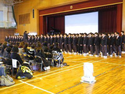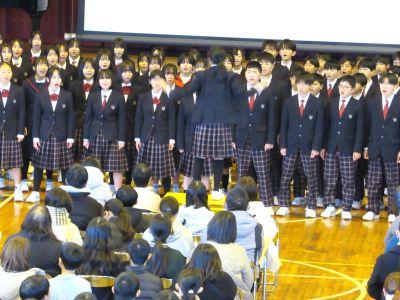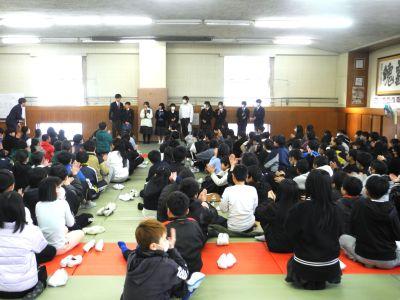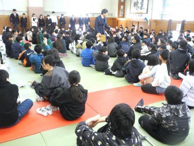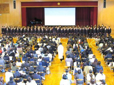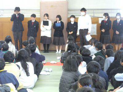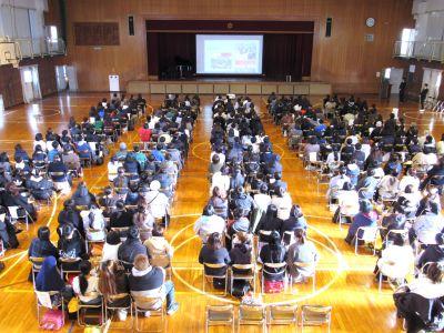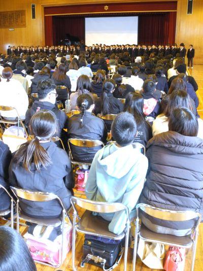 4月に入学する6年生の皆さんと保護者の方々をお迎えし、『入学説明会』を行いました。冒頭の2年生合唱「校歌」!とても寒いなか、そして、ものすごい緊張感のなか、体育館中に全力の歌声を響かせました。私も鳥肌がたつほどで、合唱を聴く6年生や保護者の様子から、2年生の「がんばり」と「メッセージ」は確実に伝わったと思います。その後、時間は短かったですが、「中学生への質問コーナー」をとても楽しい雰囲気で行い、6年生は中学校の雰囲気を感じることができたのではないかと思います。少しでも不安が解消され、入学を楽しみにすることにつながれば幸いです。中学生の張り切る姿と6年生の礼儀正しい態度が印象に残る『入学説明会』でした。