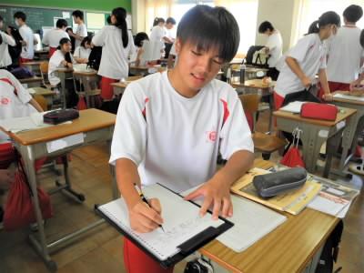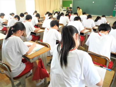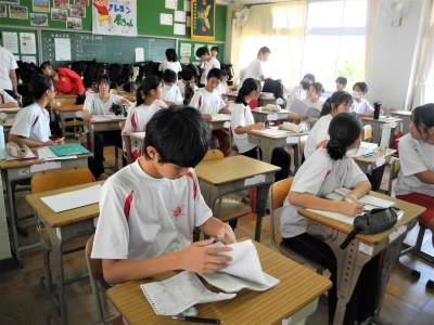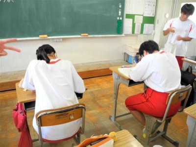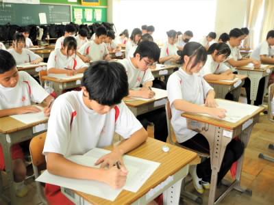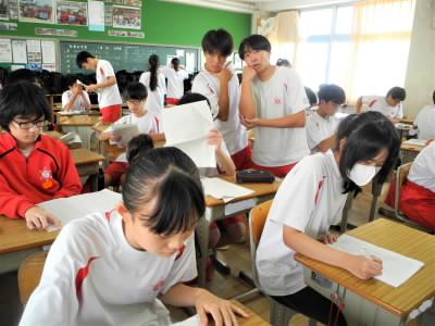 3年生が『社会科コンクール』を行いました。今日の昼放課は、最後の追い込みで、教室や廊下、そして校庭でも、必死に勉強する3年生の姿が見られました。開始の合図と同時に全員が一斉に鉛筆を走らせます。3年生の真剣なまなざしが印象的でした。