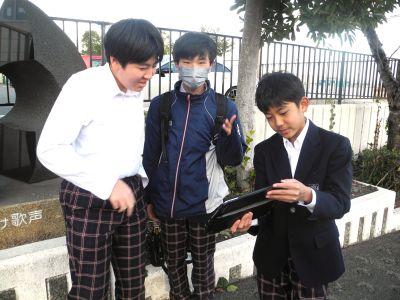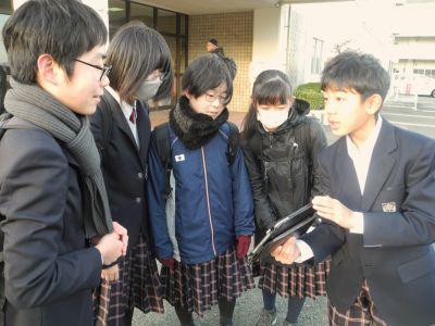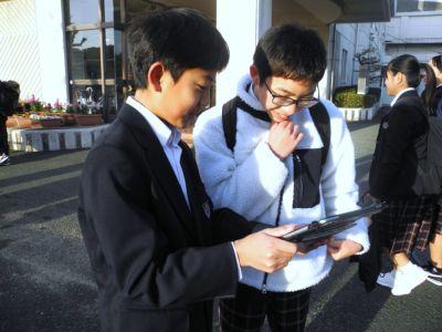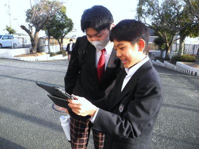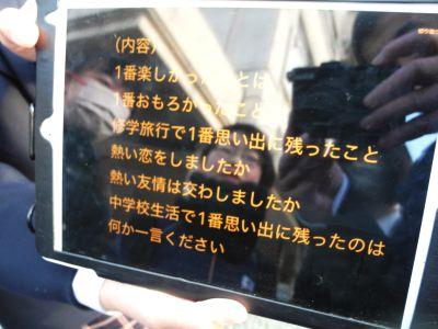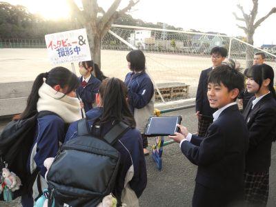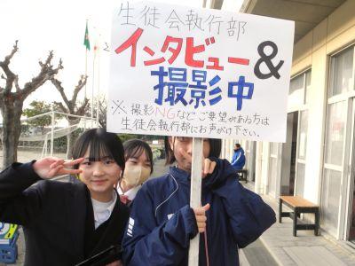 3学期に入り「『3年生を送る会』を成功させよう!」と、1・2年生の準備にも熱が入ってきました。登校時の昇降口がいつも以上に盛り上がっているのでのぞいてみると、生徒会執行部が、生徒会企画用のインタビュー撮影を行っていました。「一番楽しかったことは」「修学旅行で一番思い出に残ったことは」「熱い恋をしましたか」など、後輩たちのインタビューに、とても楽しそうに応じる3年生の姿が微笑ましかったです。どんな生徒会企画になるか、今からとても楽しみです。