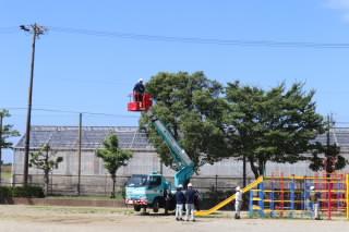 7月4日(木),市内小中学校の用務員さんにご協力いただき,校庭のケヤキやクスの木の「散髪」をしていただきました。運動場に乗り入れた高所作業車を使って,高く伸びすぎた樹木の枝を手際よく伐採していました。暑さが厳しいなか,朝から夕方まで作業をしていただきました。ご協力いただいた用務員のみなさん,ありがとうございました。