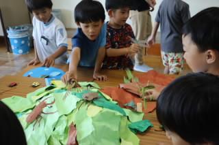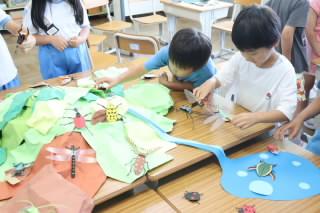 7月4日(木),本校職員の紹介で,市内各所で美術・造形作品を展示公開されている加藤さんに来校していただき,2階西学習室で「虫の世界 作品展」を開いていただきました。昨年度,来校していただき大変好評だったため,2回目の作品展です。色画用紙やお菓子の空き箱などで巧みにつくられた,クワガタやカブトムシ,バッタやチョウチョなどが展示され,見学に来た子どもたちは,彩の鮮やかさ,精巧さに驚いているようで,どうやって作られているのか関心をもつ子もいたようです。また,見学の際には,加藤さんから作品について説明してもらったり,工作の本を紹介してもらったりしました。夏休みの間に,造形作品づくりに挑戦してみてはどうですか。