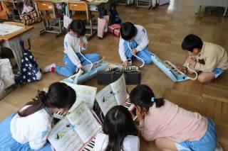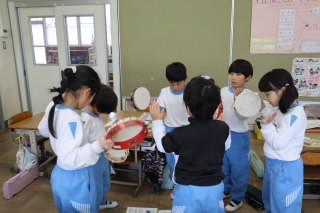 3月12日(水),職員室に「器楽合奏をするので聴きに来てください」と1年生の2人の児童が来てくれました。1組の教室に行ってみると,すでに準備が整っており,すぐに演奏を始めてくれました。演奏してくれた曲は「こいぬのマーチ」で,ピアニカやカスタネット,タンブリンなどを使って,お互いの音を聴き合いながら演奏することができました。2組の教室を覗いてみると,楽器ごとに分かれて練習をしているところでした。グループで協力しながら何度も練習している姿がとても素敵でした。