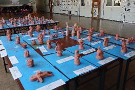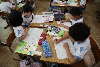 12月5日(金)4時間目に5年1組の図工の授業を参観しました。木版画の授業でした。子どもたちは、木の板に自画像を描き、彫刻刀で彫りました。彫りを入れた木の板に黒インクを塗り、のせた用紙をバレンでこすり完成です。子どもたちは、うれしそうにできあがった版画をお互いに見せ合っていました。「彫り残しの部分とか、いい感じにふっくら感がでていておもしろい」と感想を聞かせてくれました。