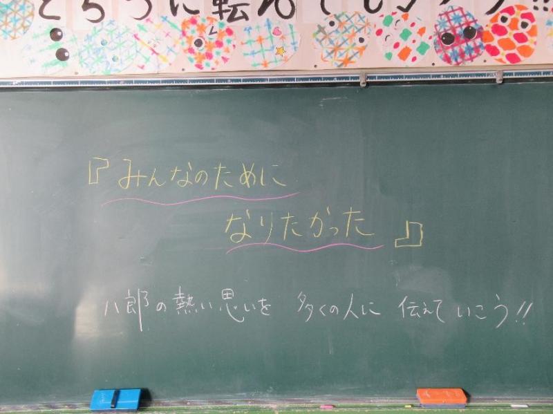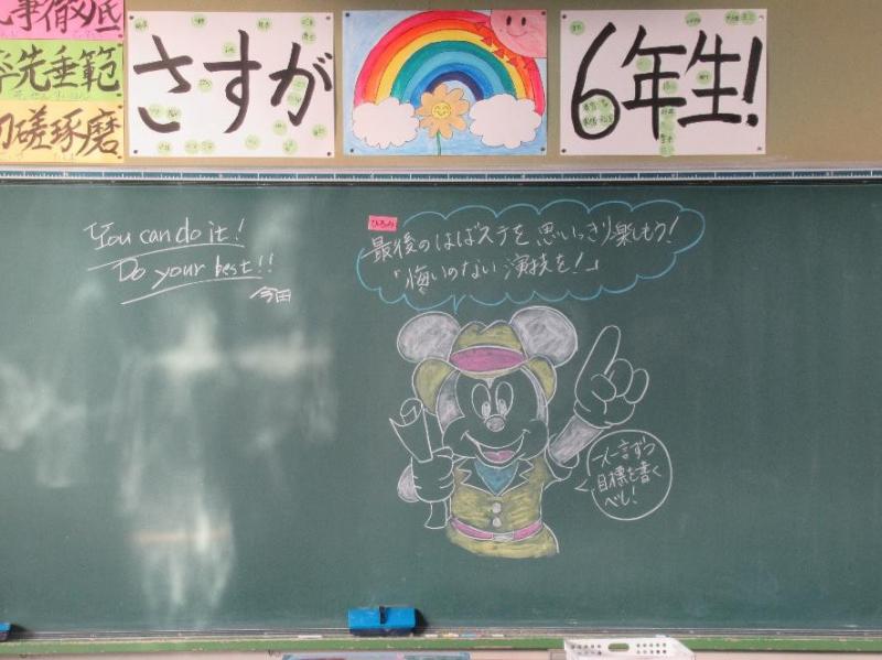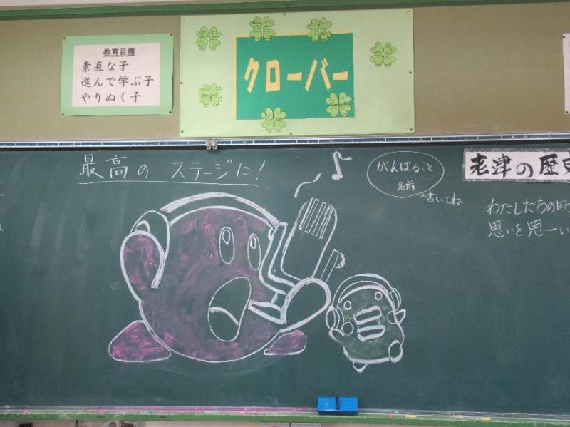 6-1教室は、5月のスポフェスの朝と同様に、登校した子から一人一人意気込みを書くつくりになっていました。きっと朝の会のころには、みんなのメッセージで黒板が埋め尽くされていたことでしょう。4-1教室もカービィが檄を飛ばしていました。