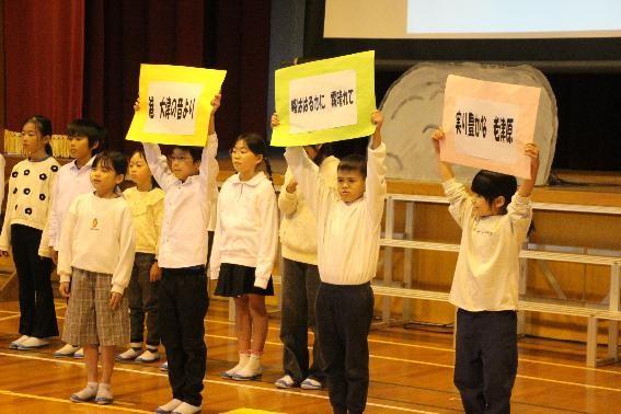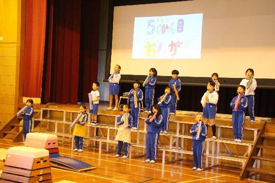 続いて1年生。算数や音楽から体育の跳び箱まで、毎日の授業で身につけたことを全員で披露できました。