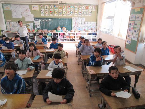 2年1組教室からは元気な歌声が聞こえてきました。全校で6年生といっしょに歌う「ライラック」です。教室をのぞいてみると、みんなノリノリでした。