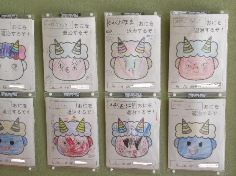 節分の日に「心の中から追い出したいおに」について話をした1年生。その日の5時間目には、追い出したいおにの顔を描き、新聞で作った豆を当てて退治したようです。今その鬼たちは、教室の背面からにらみをきかせています。