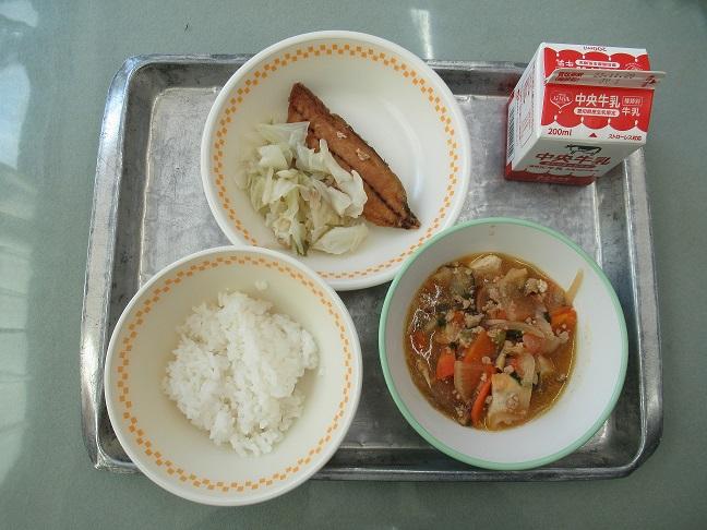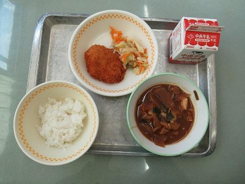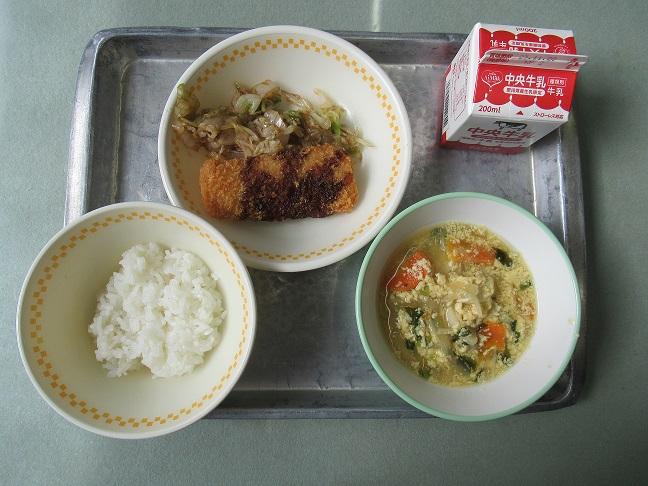かき玉汁、いかフライ、ゆで野菜、ごはん、牛乳