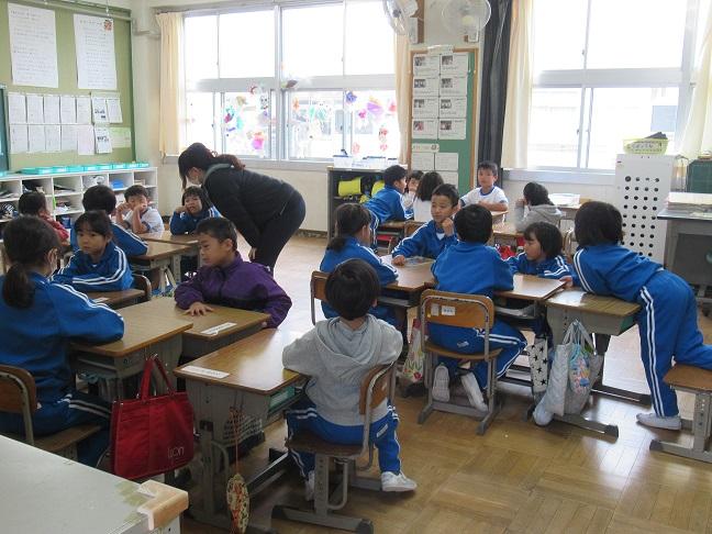 毎週水曜日の朝は、お話タイム。1の2では、近づく学習発表会『はばたきステージ』で「かっこよく発表するためにみんなどうする?」と、考えを出し合っていました。「わかめみたいにくにゃくにゃしなくて、びしっとする」など、どんどん意見が出ていました。隣の1の1では、「みんなで楽しむこと」を4~5人グループで話し合って、意見を一つにまとめる活動をしていました。1年生でも、立派に話し合っているなと感心しました。自分の考えを伝えること、グループで話し合うことの基礎を1年生で身につけようと、担任の先生がテーマ等を考えて進めています。
