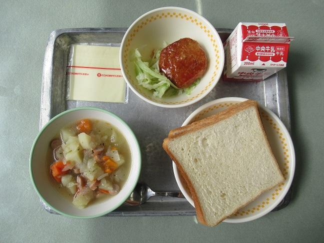 ポトフ、チーズハンバーグサンド(ゆで野菜)、牛乳