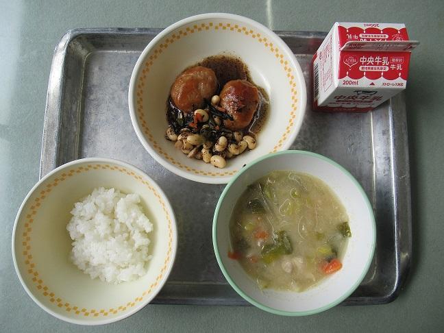 ごま汁、大豆のいそ煮、肉団子、ごはん、牛乳