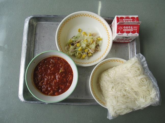 ミートソース、ソフトめん、きのことキャベツのソテー、牛乳