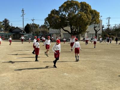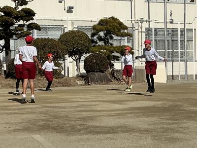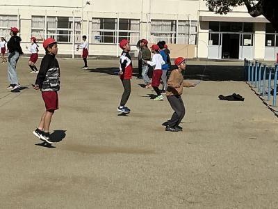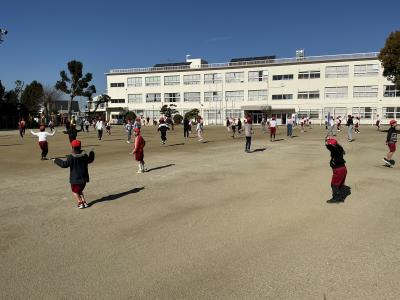 全校児童が運動場に集まり、持久跳びに挑戦です。