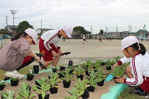 環境委員会の子たちが、モニュメント近くの花壇にビオラとストックの苗を植えました。苗の間隔が均等になるように注意しながら、そっと苗をポットから出していました。環境委員の子以外の子も手伝いに来ていました。寒い冬が色とりどりの花で心が癒されます。全校児童が気持ちよく過ごせるように、委員会の仕事をがんばる姿が素敵です。
