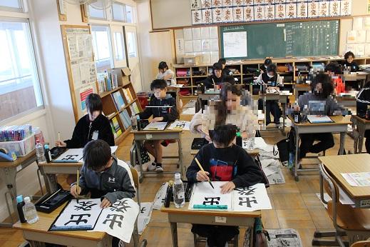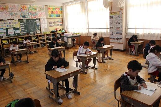 競書大会を行いました。1、2年生は硬筆、3~6年生は毛筆です。今まで練習してきた成果を出したいという気持ちから一人も声を出すこともなく、静まり返った教室の中には、筆や鉛筆が動く音だけが響いていました。書き終えた子が「きれいに書けたかわからないけれど、がんばったんだ」と、にっこりと笑て言いました。その言葉が、とてもうれしかったです。