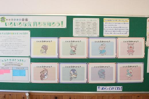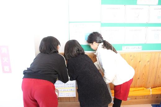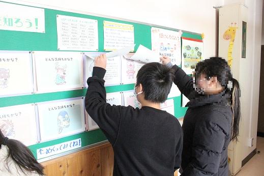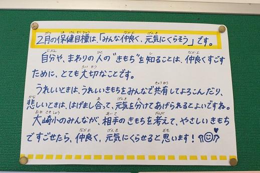 養護の先生が保健室前の掲示板に2月の保健目標「みんな仲よく、元気にくらそう」に合わせ掲示を作りました。子どもたちは悲しいときやうれしいときの自分の行動を書いたり、掲示の絵を見ながら考えたりしていました。優しい気持ちでいられると、より気持ちよく生活できるようになりますね。