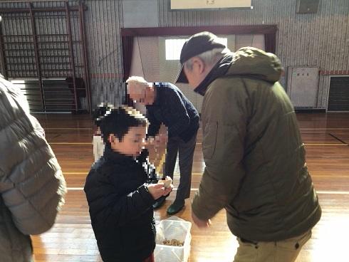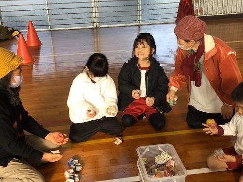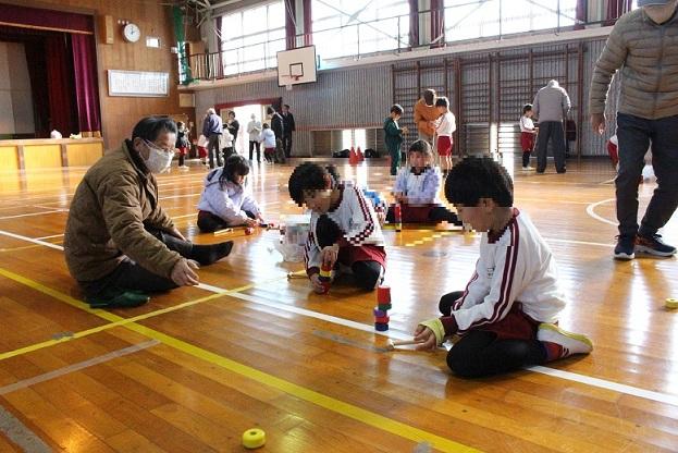1月13日、1年生が校区の老人クラブのかたに、昔のあそびを教えていただきました。こまに糸を巻くコツを教えてもらいながら、おじいさんが糸を巻く手の動きに見入っていました。一緒にこま回しをしていくと、だんだんと上手に回せるようになっていきました。お手玉やだるま落としなども教えていただき、楽しい時間を過ごしました。老人クラブのかたたち、いつもありがとうございます。