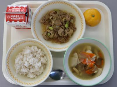 今日の給食は、豚丼、牛乳、豆腐汁、みかんです。豚丼に入っているこんにゃくは、こんにゃく芋から作られます。エネルギーの低い食べ物ですが、食物せんいが豊富なため、便秘の予防になります。