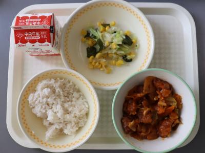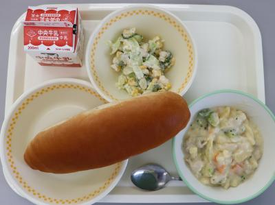 今日の給食は、くろロール、牛乳、マカロニのクリーム煮、ビーンズサラダです。マカロニのクリーム煮は、とり肉や野菜を牛乳や生クリームで煮てあります。乳製品がたっぷり入っているため、体をつくるたんぱく質やカルシウムが多く、成長期のみなさんにぴったりな料理です。今日は、ツイストマカロニが入っています。味わって食べてください。