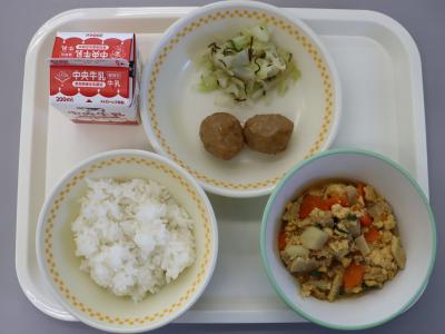 今日の給食は、ごはん、牛乳、レバー入りつくね、塩こんぶあえ、親子煮です。親子煮は、とり肉と卵を使った和風の煮物です。とり肉と卵には、体をつくるもとになるたんぱく質が多く含まれています。野菜をいっしょに食べることで、肉に不足している栄養素がとれるので、野菜もしっかり食べましょう。レバー入りつくねには、とりレバーが 含まれています。レバーは鉄分の多い食べ物で、貧血の予防になります。