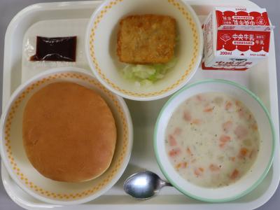 今日の給食は、フィッシュバーガー、牛乳、ポテトクリームスープです。ポテトクリームスープには、ペースト状にした白いんげん豆が入っています。白いんげん豆は、体をつくってくれるたんぱく質や熱や力になる炭水化物が多く、おなかのそうじをしてくれる食物繊維も多く含まれる食品で、世界中で食べられています。みなさんにも食べてほしい食品です。