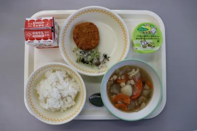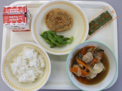 今日の給食は、ごはん、味付けのり、牛乳、とりだんご汁、米粉コロッケ、えだまめです。えだまめは、体をつくるたんぱく質や体の調子を整えるビタミンなどが含まれている体によい食べ物です。大豆になる前の緑色の時に収穫したものがえだまめです。さやのまま塩ゆでしたものが給食に出ます。さやから豆を出して、よくかんで食べてください。