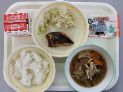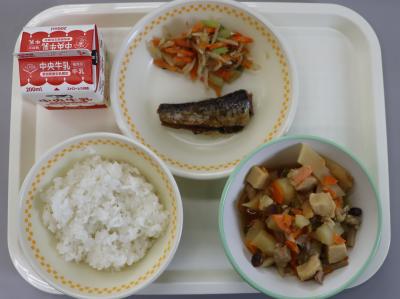 今日の給食は、ごはん、しそひじきの佃煮、牛乳、さばのてり焼き、そえやさい、五目汁です。さばには、骨をじょうぶにするカルシウムの吸収を助けるビタミンDが含まれています。五目汁はにんじん、葉ねぎ、だいこん、たけのこ、ごぼうなどの野菜ととり肉、生揚げなどの体をつくる食品もいっしょに食べられる具の種類が多い汁物です。汁物にすることで、野菜の量がたくさん食べられます。さばのてり焼きは骨に気をつけて、よくかんで食べましょう。