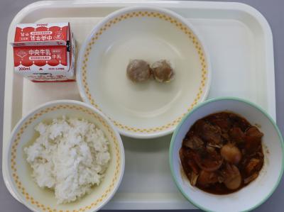 今日の給食は、ごはん、牛乳、しゅうまい、中華風夏やさいのみそいためです。中華風夏やさいのみそいためは、令和6年度の地場産物を使ったアイデア料理コンテストの入賞作品です。うずら卵、にんじん、トマト、キャベツ、ピーマン、にんにく、たまねぎ、きくらげが入っています。うずら卵は豊橋市で多くつくられています。よくかんで食べましょう。