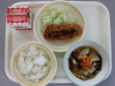 今日の給食は、ごはん、牛乳、キャベツミンチカツ、そえやさい、とうがんの米粉カレースープです。とうがんの米粉カレースープには、豊橋産のとうがんが入っています。豊橋市は全国でもとうがんの産地として有名です。あっさりとした味のため、スープや煮物、いため物など、いろいろな味をしみこませておいしく食べることができます。また、水分を多く含んでいるため、体を冷やす働きがあります。