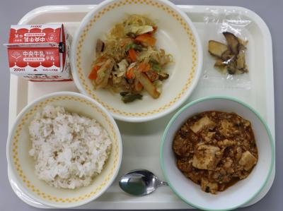 今日の給食は、麦ごはん、牛乳、マーボー豆腐、やさいとはるさめのオイスターソースいため、さつまいもチップスです。マーボー豆腐は中国四川省で生まれた有名な豆腐料理です。中国のマーボー豆腐は、トウバンジャンや山椒など辛い調味料を多く使うのでとても辛いです。給食のマーボー豆腐は、主に赤みそやケチャップで味をつけるのであまり辛くありませんが、トウバンジャンを少し加えたり、にんにく、しょうがなどを使ったりして、本格的に仕上げています。