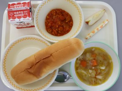 今日の給食は、チリドッグ、牛乳、やさいスープ、りんご、スティックチーズです。チリドッグの「チリ」は唐辛子のことで、トマトソースの中に唐辛子などの調味料を入れたピリ辛ソースのことをチリソースといいます。チリソースは、えびやいかなどの魚介類の煮込み料理や、サラダのドレッシングなどによくつかわれる調味料です。サンドイッチロールにチリドッグの具とスティックチーズをはさんで食べましょう。