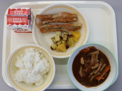 今日の給食は、ごはん、牛乳、ちくわの米粉いそべ揚げ、くりとさつまいもの甘辛煮、豚汁です。ちくわは魚のすりみを棒に巻き付けて焼いたものです。昔から豊橋では、ちくわが多く食べられています。海が近く、原料となる魚を手に入れることができたので、ちくわ作りが盛んになりました。今日の給食では、ちくわに愛知県産の米粉と青のりで作った衣をつけて、油で揚げてあります。