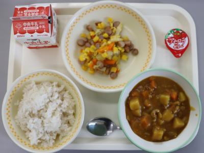 今日の給食は、米粉カレーライス、牛乳、ウインナーとやさいのソテー、一口アセロラゼリーです。カレーはインド発祥ですが、日本にはイギリスから伝わりました。日本のカレーは、小麦粉でとろみをつけていますが、本場インドのカレーはサラサラしており、汁気の多いスープのようなものです。