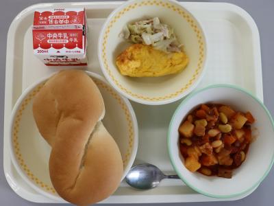 今日の給食は、クロスロール、牛乳、オムレツ、ハムとキャベツのソテー、ミックスビーンズと豚肉のトマト煮です。ミックスビーンズと豚肉のトマト煮には、白いんげん豆、金時豆、青大豆、大豆が入っています。トマトといっしょに煮込んであります。いろいろな豆の味を楽しんで食べましょう。