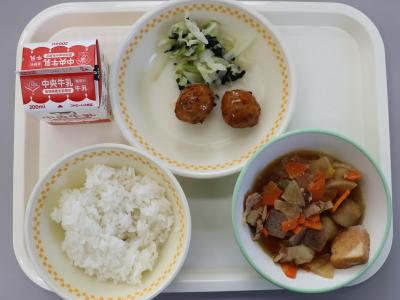 今日の給食は、ごはん、牛乳、ごぼう入りつくね、そえやさい、いも煮です。いも煮は、山形県のいもが主役のなべ料理です。1600年頃、舟で荷物を運んでいた時代に、舟つき場で里芋や積み荷の中の材料をなべで煮て食べたことが始まりだといわれています。